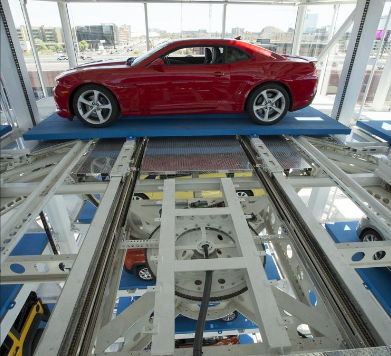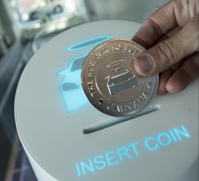 To pick-up a purchased vehicle, the customer simply drops their commemorative coin into the Machine’s coin slot, which then illuminates the coin receptacle and prompts audio and visual signals to the customer that the Vending Machine’s automated vehicle delivery system is coming to life. While the customer watches, the Vending Machine then retrieves the vehicle from the 90-foot tall steel and glass tower and places it on a track, which moves the car through the machine and delivers it to one of four delivery bays. The vehicle bay then opens and the customer is invited in to take possession of their car. The customer then has seven days to drive the car around town before ultimately deciding if the vehicle is right for them.