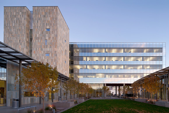 The $70 million dollar complex is one of Chandler’s first green buildings and received a LEED designation through energy efficient systems, on site electrical generation, innovative wastewater technologies, and recycling of construction waste products. Exterior shading devices were implemented to alleviate Arizona’s intense sun. Along the western side of the building is a piece of artwork that doubles as shade: individual, stainless steel, perforated panels move with the wind, giving a rippling effect, and are lit with LED lights. Whole building energy analysis predicts 38% lower energy use than a typical office building.