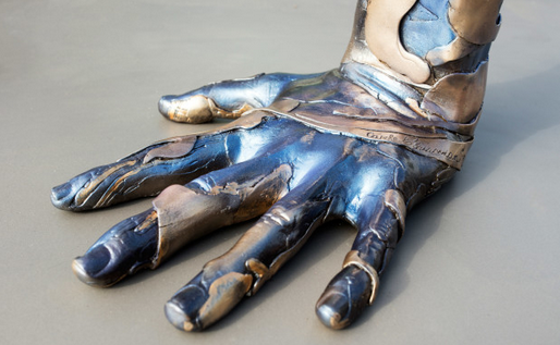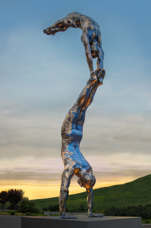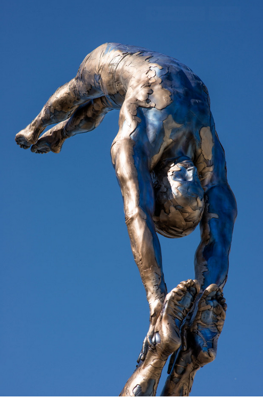 The gravity-defying bronze sculpture is both a remarkable artwork and an incredible feat of engineering. Composed of two monumental divers connected at a tenuous junction (the top figure rests its hands around the ankles of the lower diver) the sculpture’s dynamic “S” curve is revealed from its dramatic side views.  The form is a perfect example of what eighteenth-century art theorist William Hogarth called ‘the line of beauty’: that curving serpentine silhouette found in all things naturally beautiful. Within the bronze is a substantial stainless steel matrix that anchors the 2 1/2 tons of bronze. But for the viewer, the mystery remains of how the huge, graceful piece stands on the two six inch wrists and hands of the lower figure.