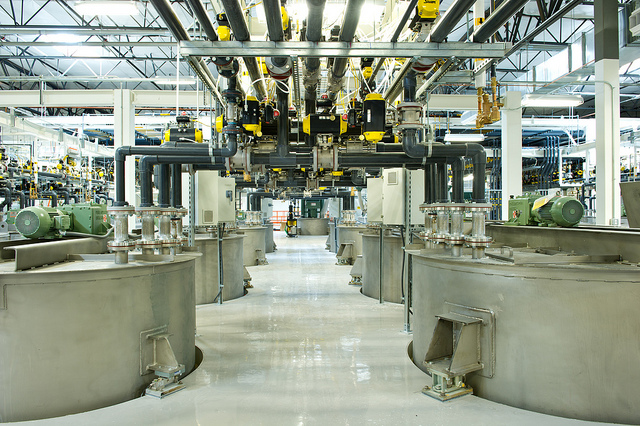 At one end of the plant, engineers in a large lab develop paints and work on improving them. Nearby, outside the lab, workers mix the powders and liquids for water-based paint in giant tanks. In another area, machines move pails and 5-gallon buckets that are filled, capped and then packaged in a plastic seal that can be recycled. Workers operate the machinery, which handles the bulk of the heavy lifting.