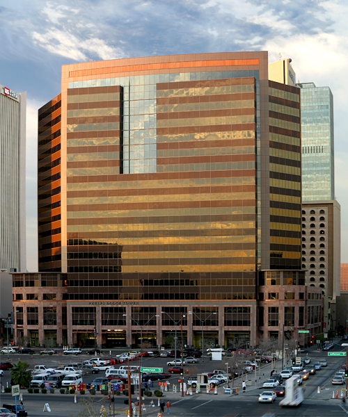 Located on a city-owned site in the heart of Phoenix, the building offers large floor plates (up to 30,900 square feet) with minimal interior columns for interior design flexibility. The 4-level garage accommodates up to 1,000 cars. The exterior base of the building is Arizona sandstone and granite. The upper floors are sheathed in copper-tinted glass curtain wall. The award-winning tower presents a sweeping curve along its north side providing panoramic views in the distance.