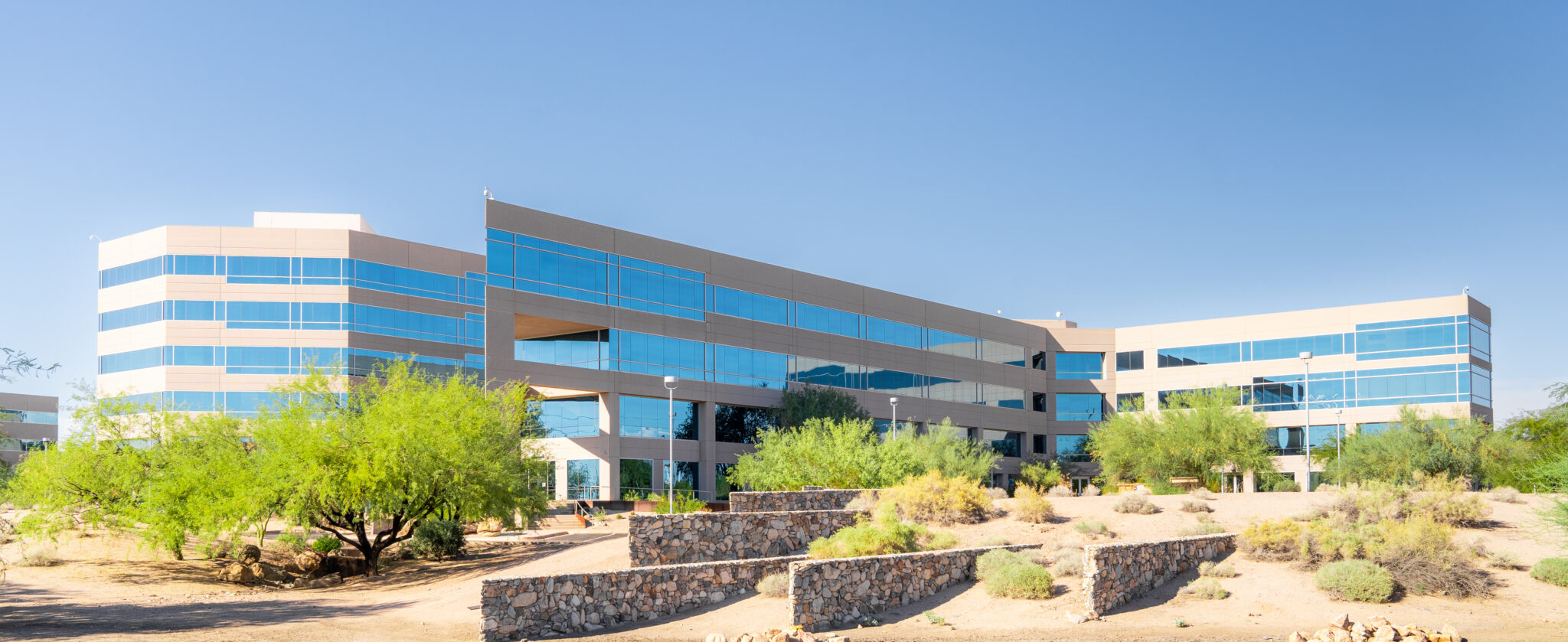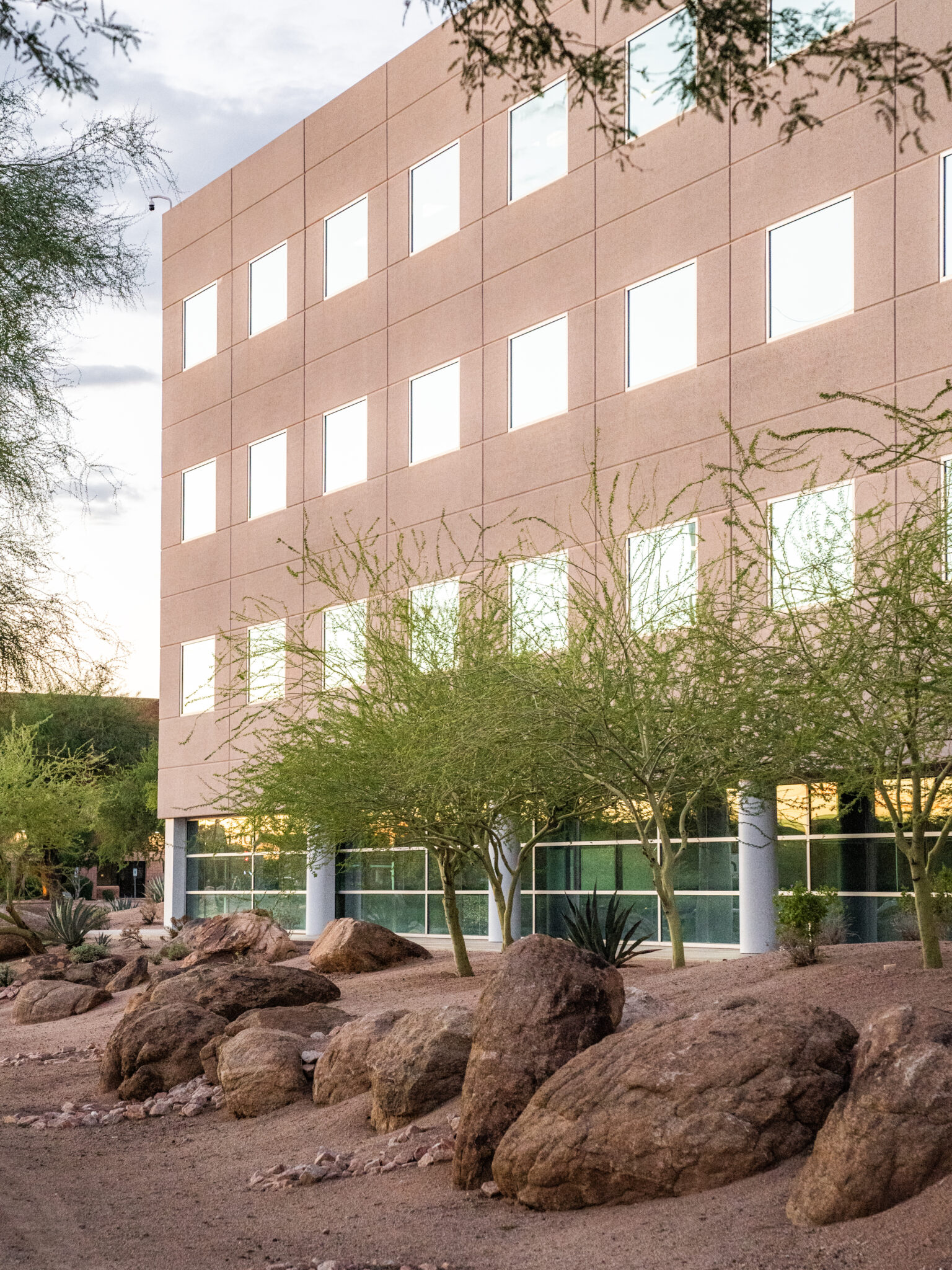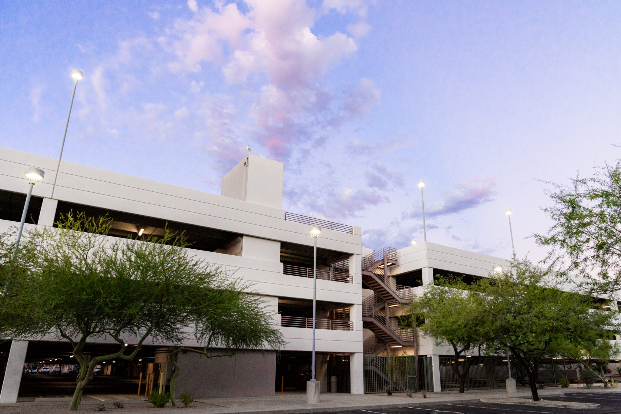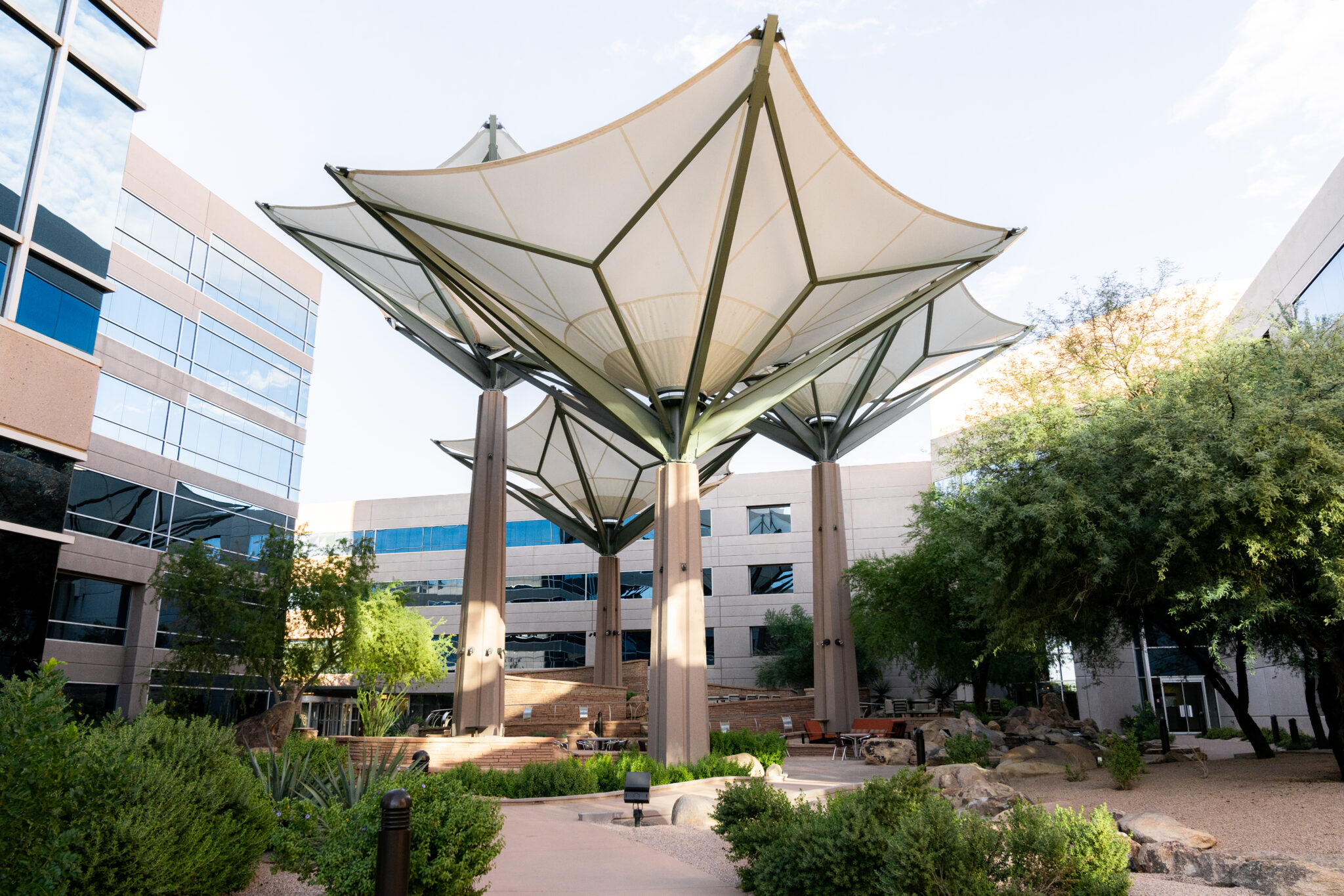 The Papago Buttes Corporate Plaza development is a 450,000 SF Class A Office & Parking Complex. Phase I consisted of a 4-story, 280,000 SF Office Building with an adjacent 4-Level, 765 car Parking Garage. Phase II included a 6-story, 170,000 SF Office Building with an adjoining 5-level, 955 car Parking Garage. The floors utilize composite steel beams that allow for an ever changing tenant mix, providing both high load capacity, as well as low vibration for the tenants comfort. The site also features a large atrium terraced into many levels with meandering sidewalks, streams of water and pedestrian bridges designed to accommodate outdoor formal and informal gatherings. Topping out at close to 90 feet in height, the atrium’s grandest features are the pre-cast, steel and tensile fabric “trees” that shade the area.