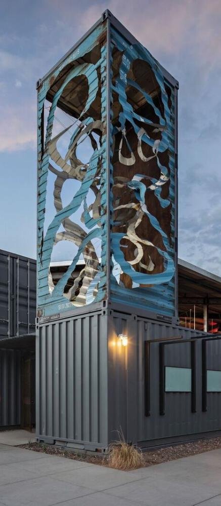 The Churchill, opened on September 1, 2018 and introduces shoppers to ten local businesses. The project is constructed entirely from decommissioned shipping containers. Perhaps the most ambitious feature of the project is a container propped up vertically 30 feet on the southwest corner of the complex. Prominent Phoenix artist Pete Deise cut the container’s steel and twisted it—seemingly flipping it inside out—into a sculpture sure to become an icon of the entire project.