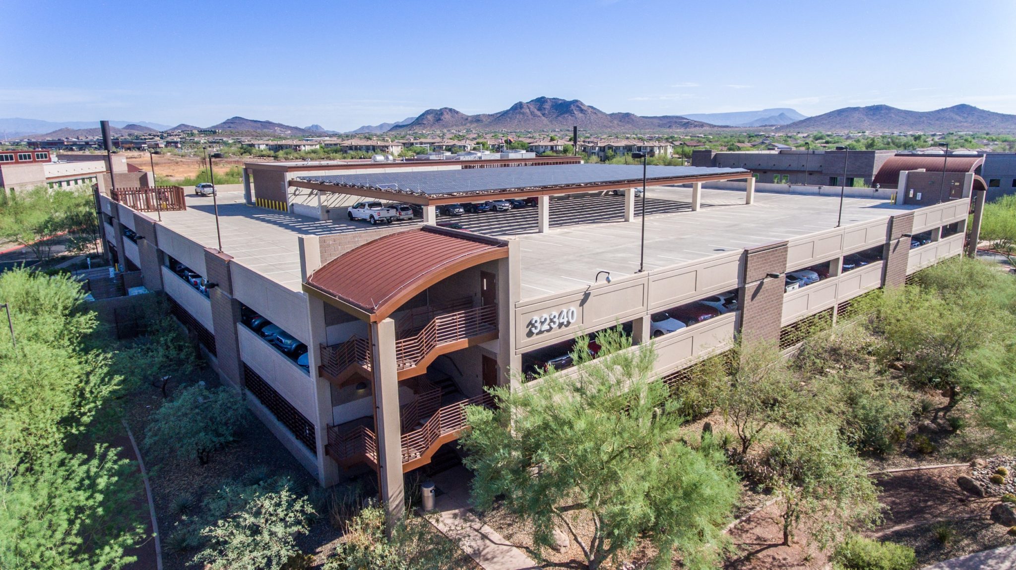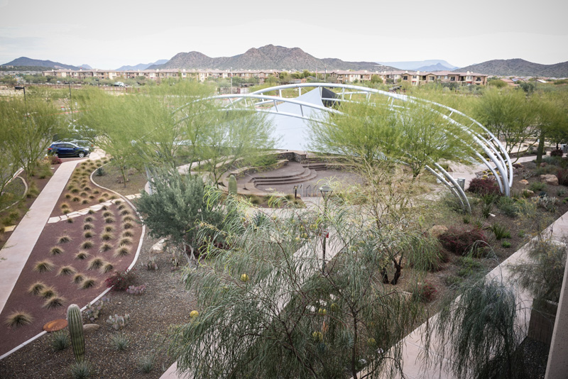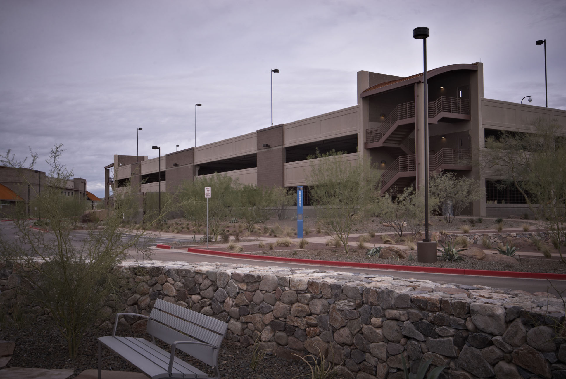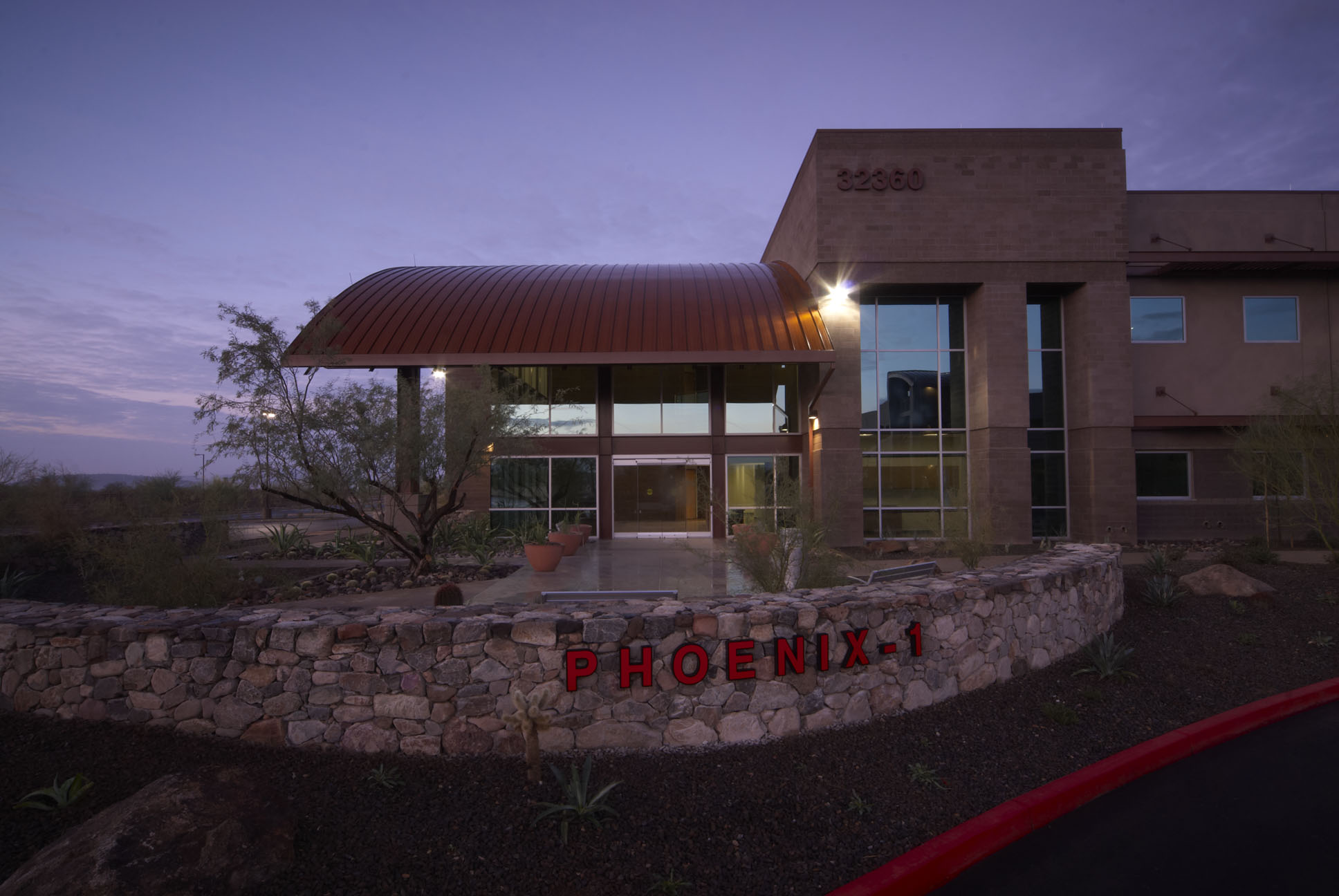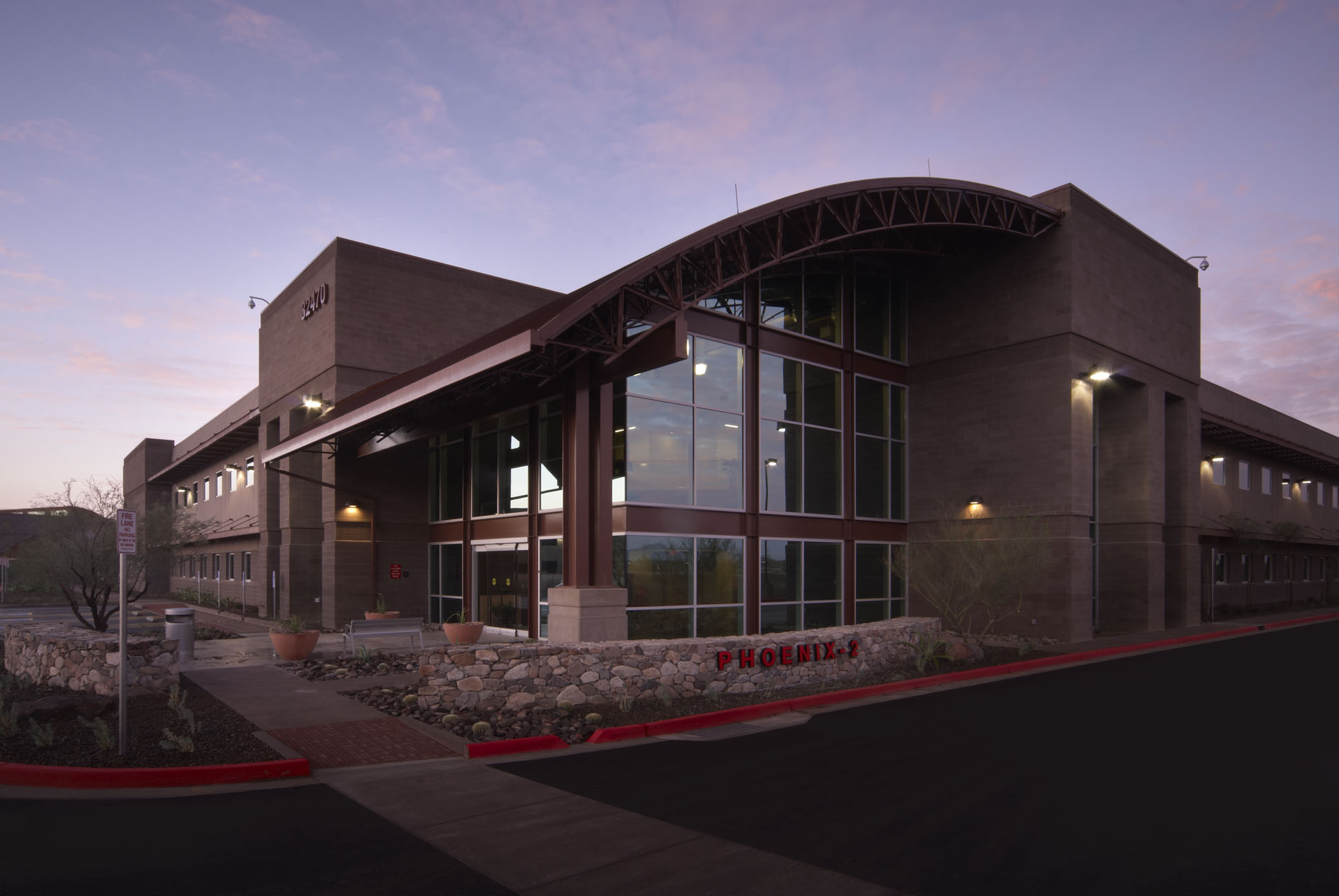 The Pinnacle Peak Biomedical Campus is 25-acres in the Sonoran Foothills, and because of the beautiful surroundings landscape design incorporated Gabion walls, desert pedestrian trails, native plants and materials as well as outdoor recreation and meeting spaces. Phase I & II includes three manufacturing buildings around a circular drive enclosing a parking structure and amphitheater. Offices, a cafeteria, an outdoor half-court basketball court and a sand volleyball court complete the campus.